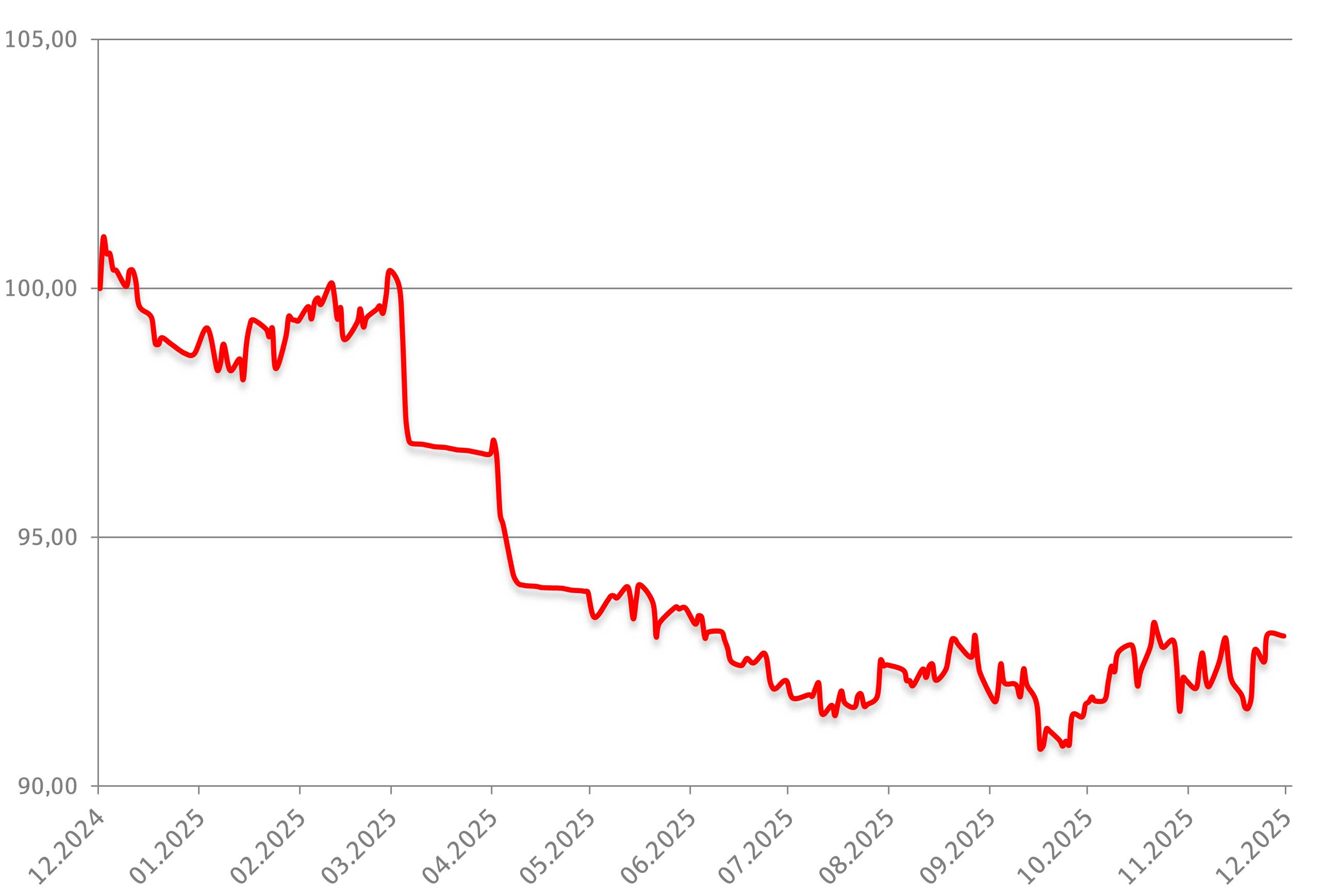 Kursentwicklung des Deka-StrategieGlobal für die Tranche 12-2024 (Zeitraum 01.12.2024-30.11.2025).Der Schlusskurs zum 30.11.2025 lag bei 93,02%.