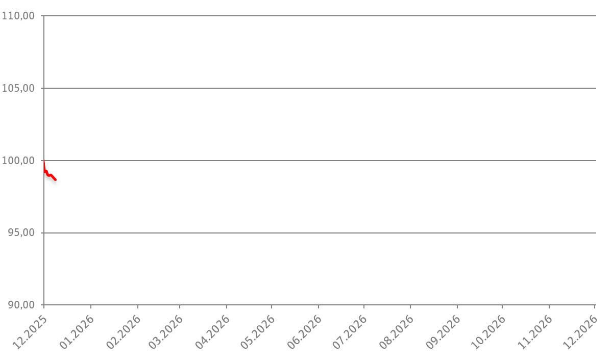Kursentwicklung des Deka-StrategieGlobal für die Tranche 12-2025.Der Kurs liegt aktuell bei 98,67% (Stand 09.12.2025).